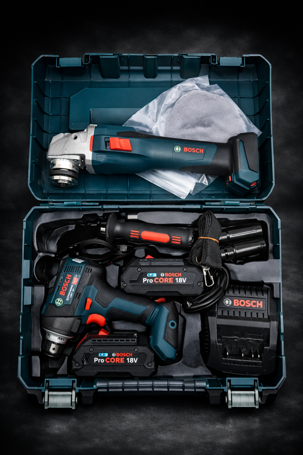 Комплектът включва винтоверт и ъглошлайф Bosch Professional, работещи с мощни ProCORE 18V батерии, които осигуряват дълъг живот, силна производителност и бързо зареждане.